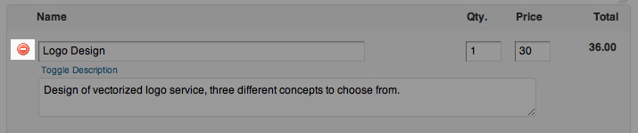 Description: This field is originally hidden and can be toggled with the “toggle description” link, underneath the Name field.A small paragraph giving more detail about the nature of the product or service. Especially helpful to Web Professionals who like to break up every invoice into different services that the client would never understand on his own. For example, the description for “PSD Slicing” could be “Creation of HTML / CSS code for static Photoshop web design”. Be creative but short.